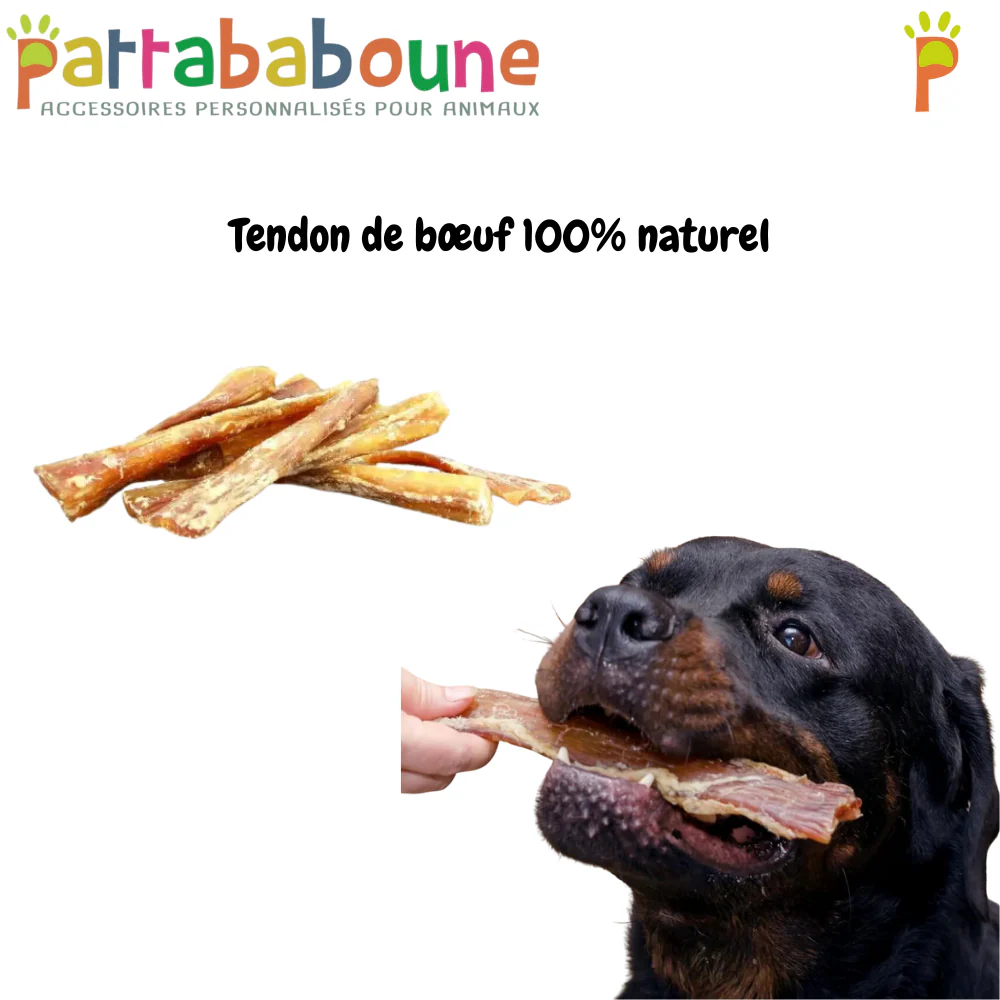 💪 Renforce les muscles de la mâchoire : les tendons de bœuf sont résistants, ce qui permet à votre chien de mastiquer longtemps, renforçant ainsi les muscles de sa mâchoire(